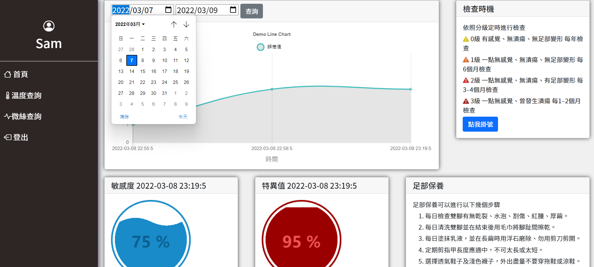 為解決傳統糖尿病足檢測之問題,我們開發一個系統讓糖尿病患者可輕鬆在家中完成檢測,並自動將資料上傳到雲端,醫生可遠端通過瀏覽器輕易察看檢測結果與分析,簡化醫病雙方的使用流程,提供糖尿病患者足部神經病變的預防及篩檢。